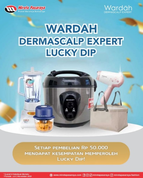Jadi tunggu apa lagi? Yuk, datang ke Mirota Pasaraya Jl. Kaliurang km 6,1 dan rasakan sensasi belanja seru penuh kejutan dari Wardah Dermascalp Expert Lucky Dip!